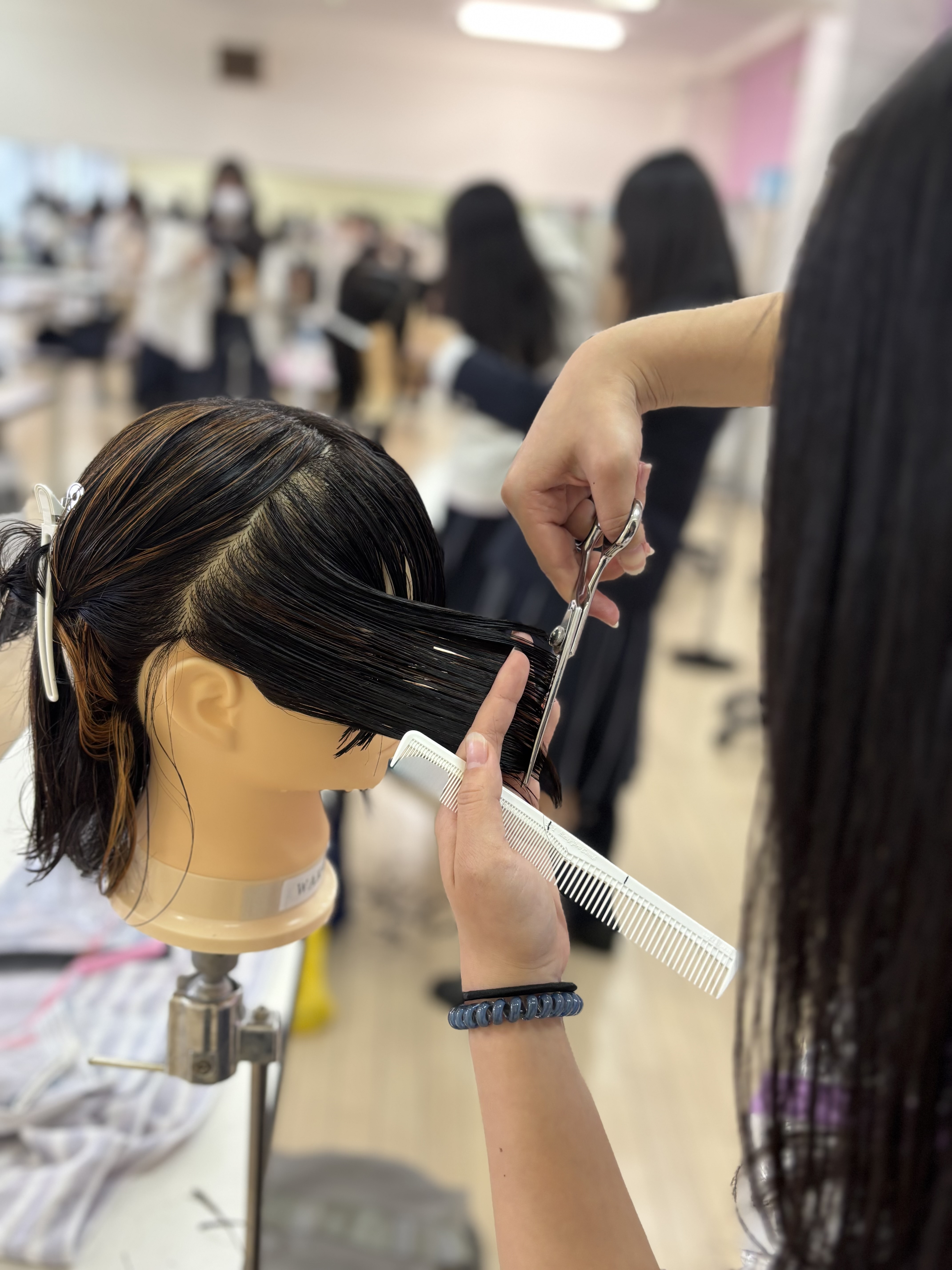 美容芸術コースの実習では、ヘアカットの基礎技術に取り組みました!