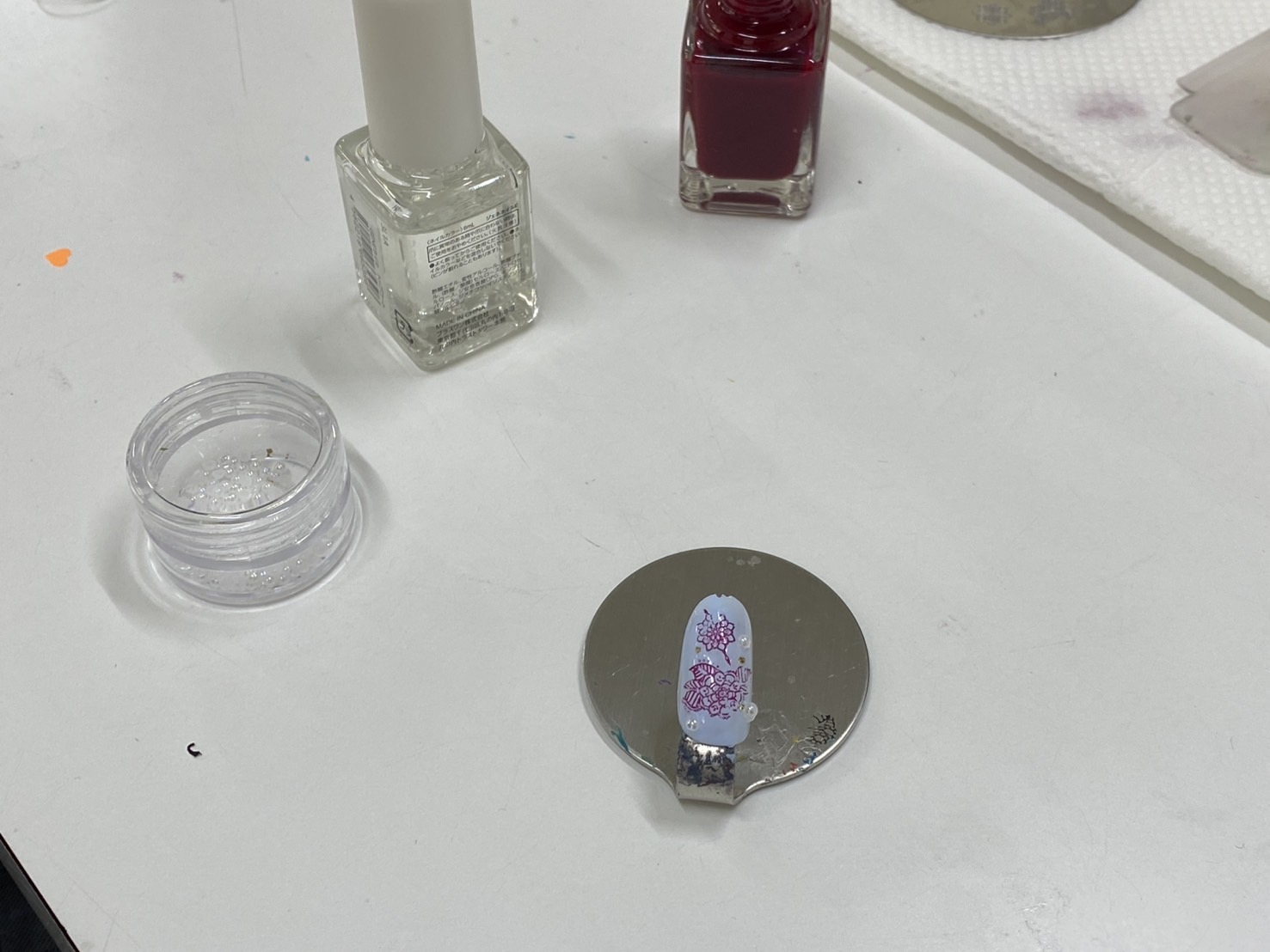 ネイルの授業では、好きな模様を選んでスタンピングネイルに挑戦していただきました💅
